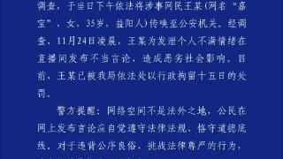 湖南益阳警方通报:王某网名“嘉宝”发布不当言论 被行拘15日